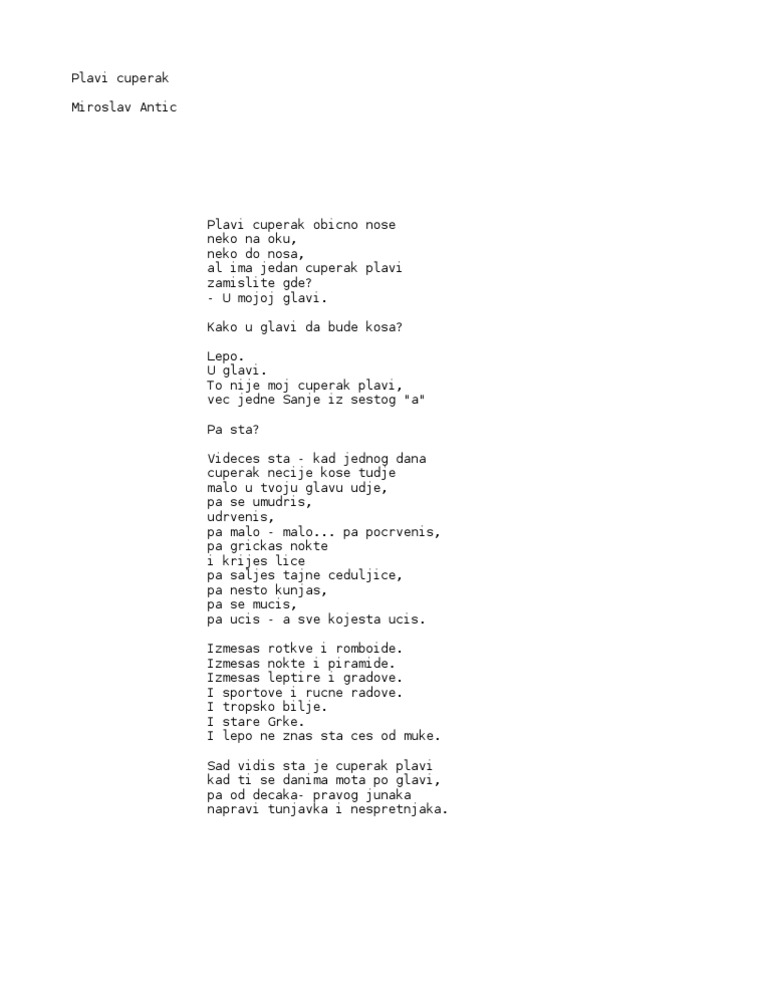 Plavi čuperak miroslava antića skup je pjesama za one koji tek ulaze u adolescentnu dob u razdoblje rađanja ljubavi otvorenih puteva razočaranja nadanja. Vidjećeš šta kad jednog dana čuperak nečije kose tuđe malo u tvoju glavu uđe pa se umudriš udrveniš. у вечерњим сатима проглашено ванредно стање одлука о проглашењу ванредног стања службени гласник рс бр 29 2020 од 15 03 2020. Videces sta kad jednog dana cuperak necije kose tudje malo u tvoju glavu udje pa se umudris udrvenis pa malo malo pa.