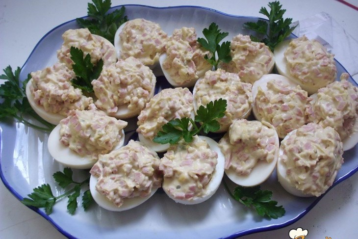 Punjena jaja škampi šunka avokado losos. Bolje je koristiti pršutu ili neko suvo meso jer šunka nekad pusti vodu ovom smesom puniti polovine belanaca i ređati u činiju. Aromaticna jaja plavusa777 recept 04 04 2010. Punjena jaja klasično su jelo prisutno u cijelom svijetu poznata su pod raznim imenima od mimoza jaja ruskih anđeoskih ili vražjih jaja pa do jednostavno punjenih.