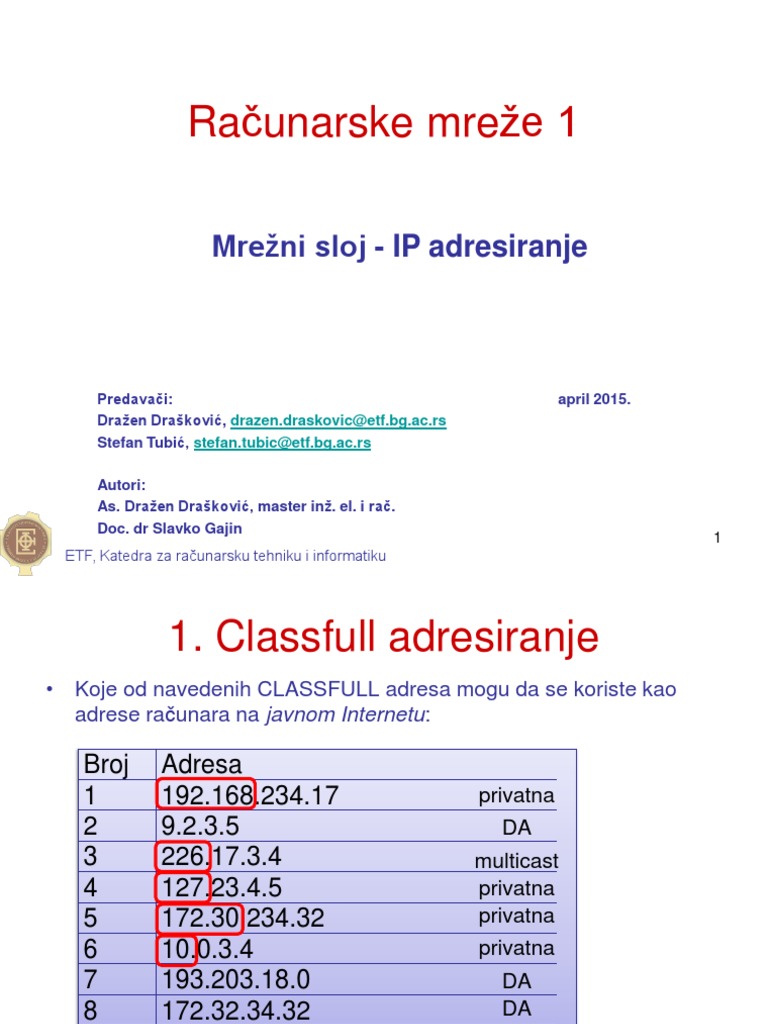 Tcp Ip Racunarske Mreze 1 Slajdovi Eelektrotehnicki Fakultet Docsity